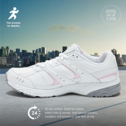 LIGHTWEIGHT WOMEN’S WALKING SHOES – Available in ladies size 6 to 11 in all white or white with trim, these reliable womens white sneakers and court shoes go with everything and are great for women walking or standing all day.