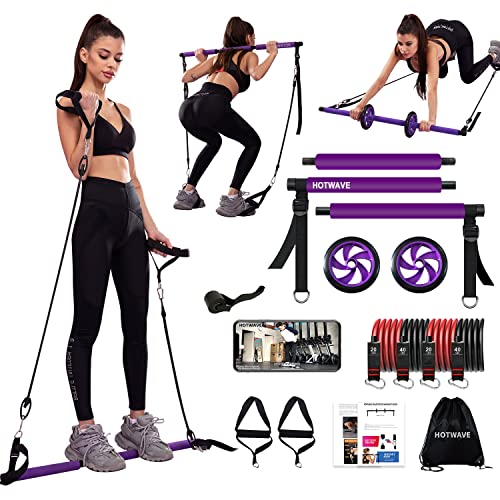 HOTWAVE Pilates Bar Kit with Resistance Bands. Fitness Bar with Ab Roller for Abs Workout. Squat Machine.Core Strength Training Equipment.Portable Home Gym for Men and Women